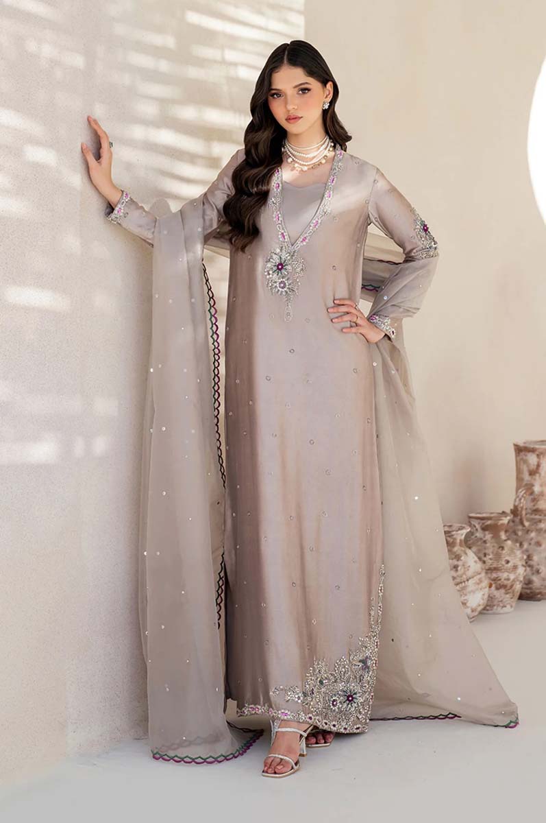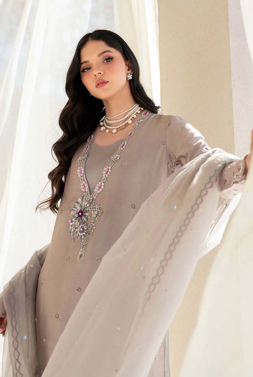 , Eris, shines with understated elegance. This grey ensemble combines Raw silk fabrics with intricate hand embroidery and sequin work, complemented by an Organza dupatta. Ideal for those who crave timeless sophistication during the festive season!