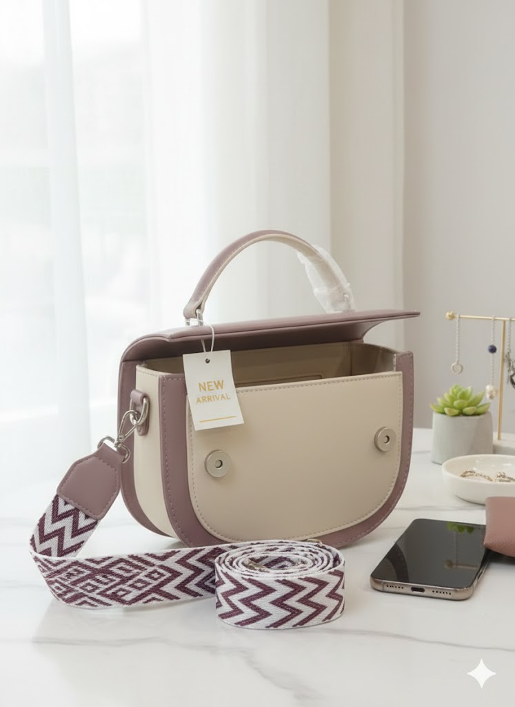 Elevate your everyday look with our latest Mauve & Cream Crossbody. Featuring a unique saddle-bag silhouette and a bold, geometric-patterned strap, it’s the perfect blend of modern chic and boho-flair. Whether you’re heading to brunch or a boutique crawl, this bag says you’ve arrived.