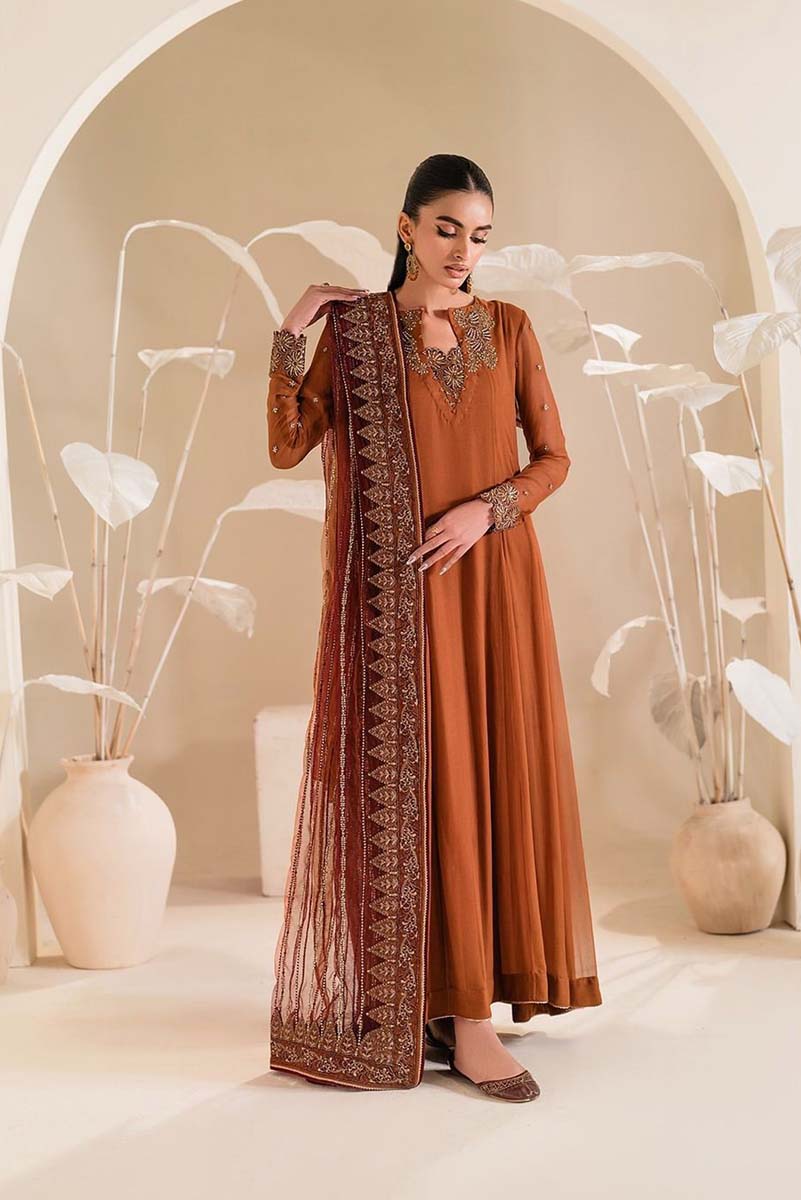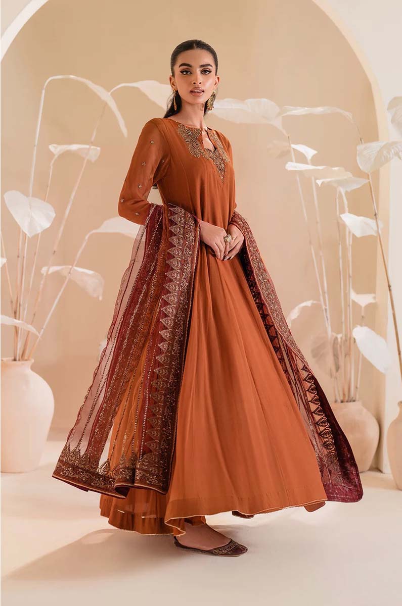 A flowing long frock, a statement embroidered organza dupatta, and the richness of Grip trousers—your go-to outfit for effortless sophistication!